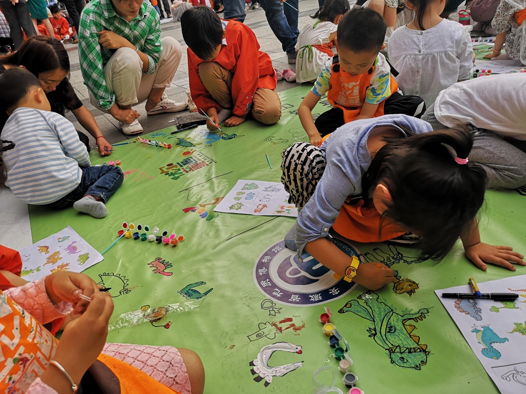 “童心绘鱼龙”活动现场,100多位小朋友现场手绘鱼龙,用丰富的想象力,绘制出一幅精彩的鱼龙巨作,讲述着孩子们对神秘的鱼龙和恐龙的向往。