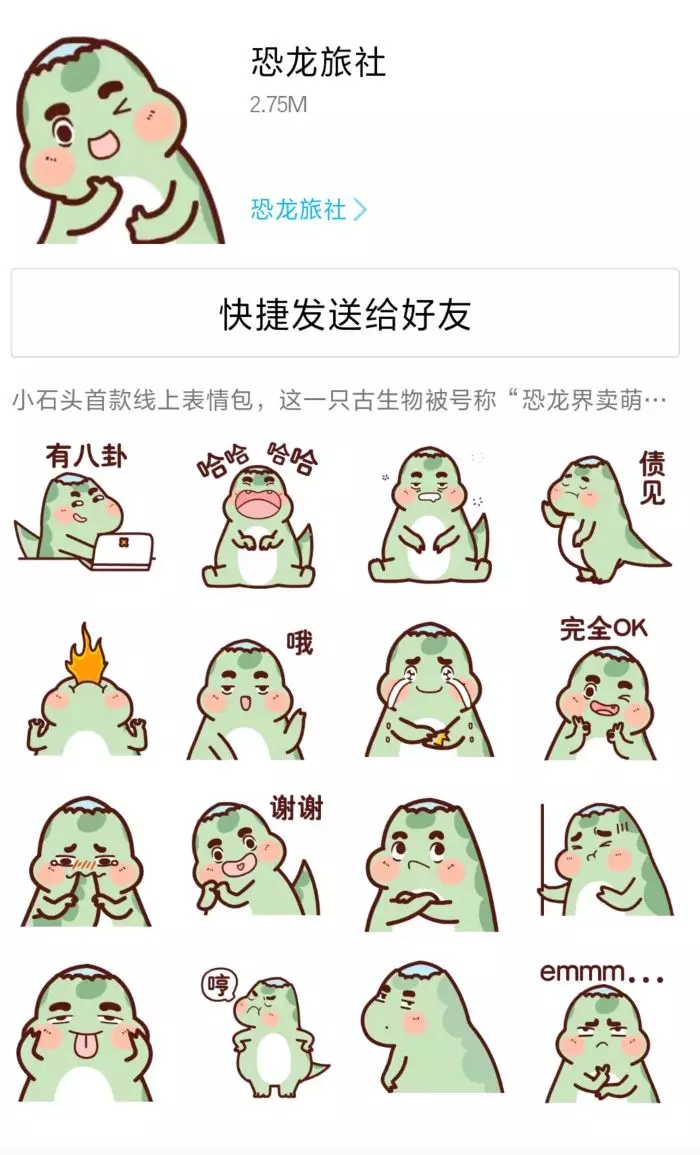 2018年7月,“小石头”首款线上表情包发布首日,便收获了上千万下载量与发送量,被线上粉丝亲切的称呼为“恐龙界卖萌担当”“龙中柯基”“地博第一萌宠”等。