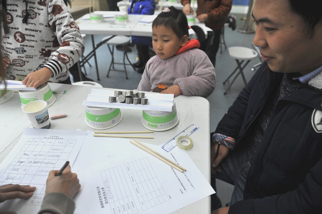 与外界的寒冷相比,馆内除了人流如织,活动现场更是热火朝天。恐龙厅的玻璃小屋内,科普老师带着家长和孩子们,为恐龙造起了“大桥”。这是安徽省地质博物馆的实验互动活动“搞事研究所”的第二期,平板桥、折叠桥、拱桥、斜拉桥···小朋友们脑洞大开,用硬币来测试自己刚制作完成的大桥支撑力。小工程师们造桥、记录、分析,整个现场是理性的角逐和较量。