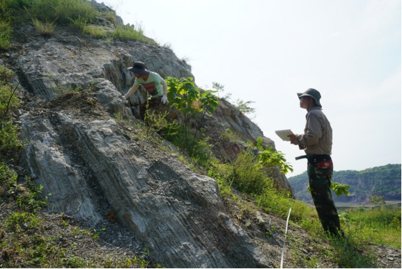 巢湖马家山野外工作属“安徽早三叠世巢湖鱼龙动物群古环境研究”项目,主要任务包括测制巢湖鱼龙生物群所在区域马家山的地层剖面,观察记录岩石岩性特征和沉积微相,采集岩石标本。馆领导充分肯定了科研人员推进项目进展的努力和成绩,表示大家不畏高温,不畏生活条件的艰苦,在烈日下辛勤工作,这种不怕苦、不怕累的精神值得全馆学习,要求相关部室积极做好服务工作。