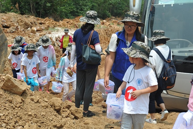 作为我馆特色科普活动,6月28日伊始,活动前期培训、鱼龙讲堂、火山岩讲堂等预热课程便持续进行开来。在布置活动任务、分发印章图册及外出服装、野外工具时,孩子们的小脸都乐开了花。“金钉子是啥?”“动物的遗体怎么就变成了石头?”带着一大堆问题,6月29日一大早,孩子们便出发前往巢湖鱼龙化石发掘地探寻地貌。赴明光女山古火山口,感受地质变迁。