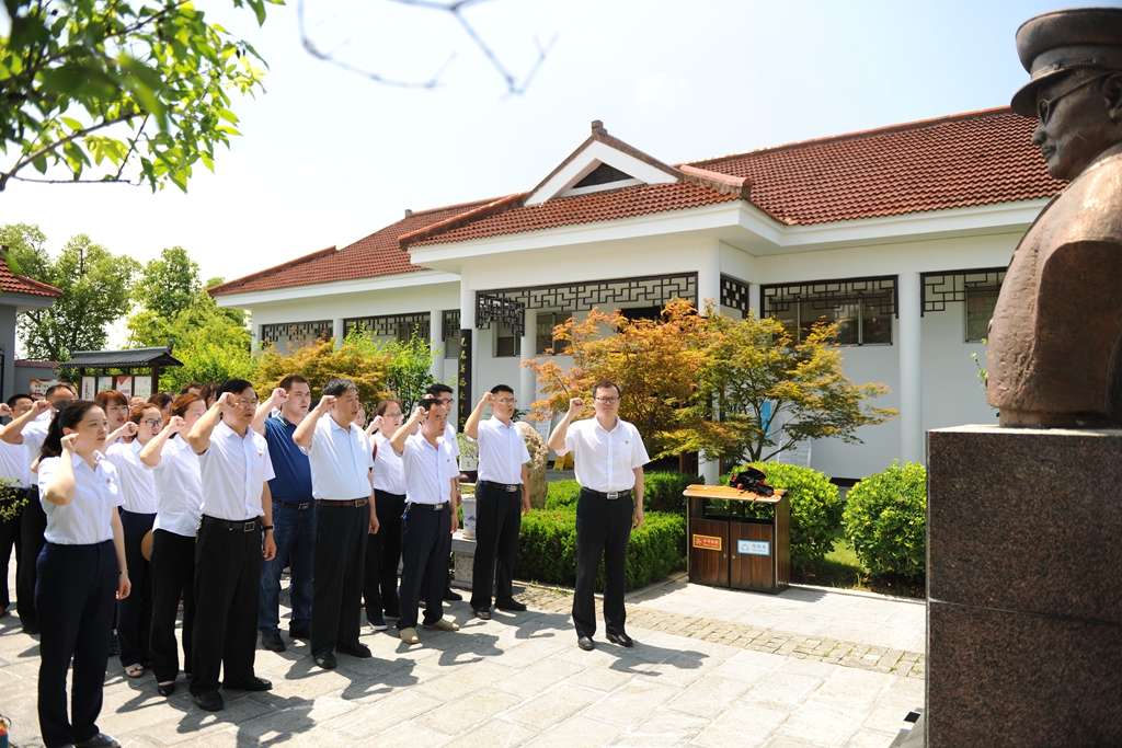 7月11日,我馆党员干部与山东省地质博物馆一行6名党员干部走进位于巢湖市的李克农故居,缅怀革命先烈。在李克农生平事迹图片展览馆,大家通过认真参观图文介绍、历史实物,重温了李克农将军波澜壮阔而又充满传奇的一生,深刻感受到李克农将军对党忠诚、不怕牺牲的大无畏精神。随后,全体党员干部重温入党誓词,高举右臂,紧握右拳,面对党旗,庄严宣誓:“我志愿加入中国共产党,拥护党的纲领,遵守党的章程……”。
