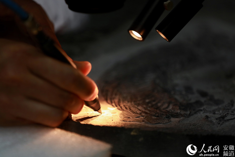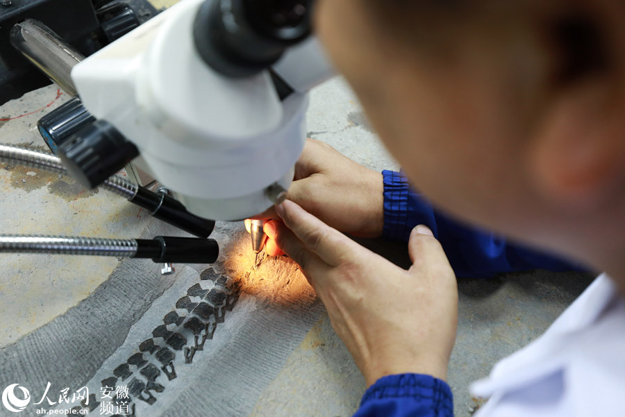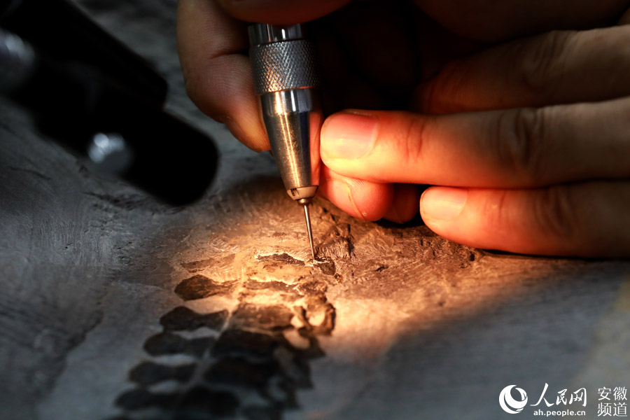人民网合肥7月5日电(赵越 张俊 实习生刘亚男)戴上口罩、打开显微镜、拿起气动笔,笔尖飞速转动,发出轻微的“咝咝”声……在安徽省地质博物馆修复室内,聚光灯下,47岁的黄发忠开始了一天的工作。而从事化石修复,他一干就是19年。
