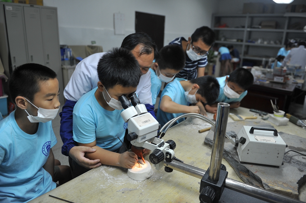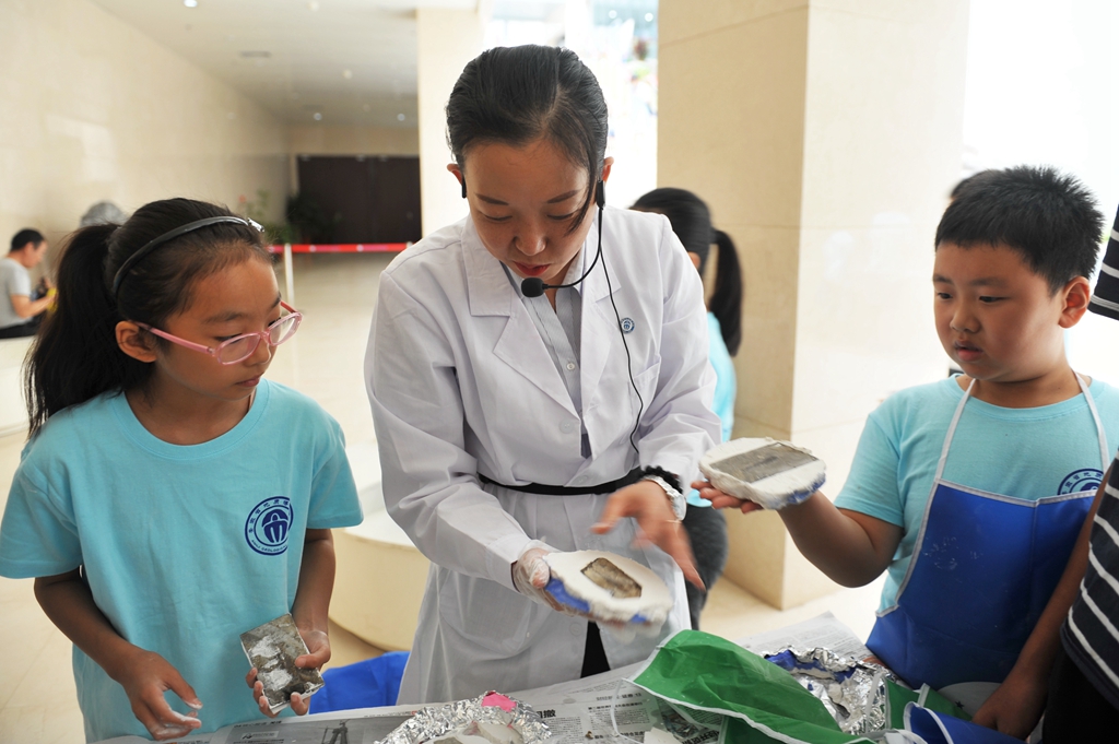 7月14日,又一批小讲解员通过培训完成考核,顺利结业了。不知不觉,安徽省地质博物馆的小小讲解员培训班已经办到了第八期。每年的暑假两期,寒假一期,算下来,如今已经过了三个年头。从最初的生源稀少,到如今的名额靠抢、报名拼手速;从原先小讲解员背着红绶带在馆内学习,到如今着装统一、专家授课、馆内练习、馆外交流……从刚开始的摸索体验,到如今涵盖普通话培训、礼仪形体、修复体验、科普影片、标本制作、外出拓展等多样化系列课程……每一年,我们都在尝试更多的可能性。