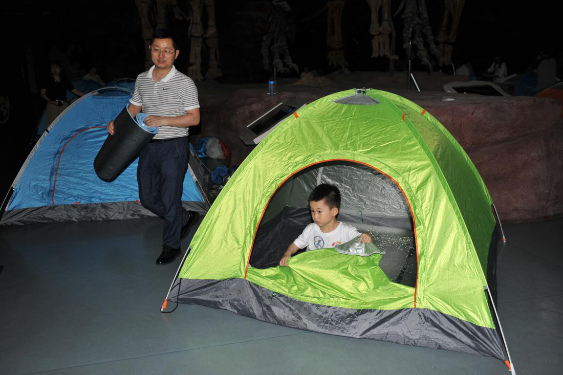 孩子们在讲解老师的带领下了解有关地震、滑坡、泥石流等地质灾害知识,探寻地质古生物故事。在三叶虫化石修复和恐龙浮雕制作的过程中,看着埋藏地下亿万年的化石在自己手中逐渐呈现出原貌,还有石膏脱模后可爱的恐龙,孩子们欢呼雀跃。和家长一起搭帐篷,小朋友们互帮互助,同时也锻炼了孩子们的动手能力和野外生存能力。躺在帐篷中,在星光下观赏恐龙化石,20组家庭在这里感受到了专属于他们的博物馆之夜。