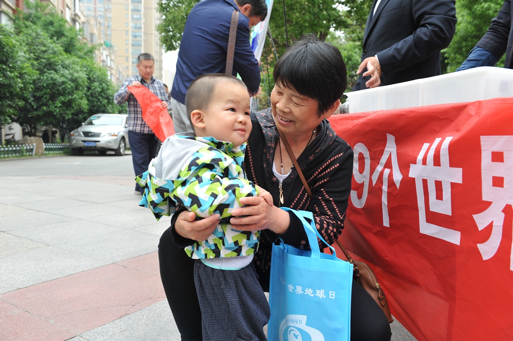 “婆婆,送您一个环保袋,咱尽量减少塑料购物袋的使用。”