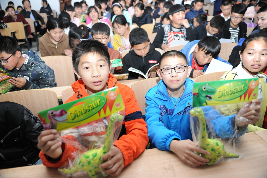 没得到奖品怎么办?没关系!热情大方的巢湖龙怎会让来参与微视频活动的各位空手而归?在活动最后,现场的所有学生都收到了地博科普大篷车带来的精美的科普图书。