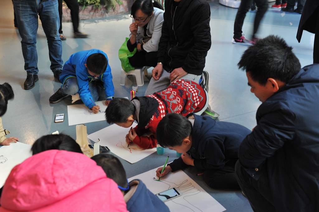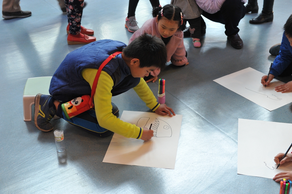 在讲解员小姐姐的带领下参观完恐龙厅后,10组家庭的孩子们便开始在一层的恐龙骨架旁开始“复原”恐龙。小朋友们一边时不时抬头观察身旁的恐龙骨架,一边充分发挥想象力画出自己心目中最喜欢的恐龙形象。