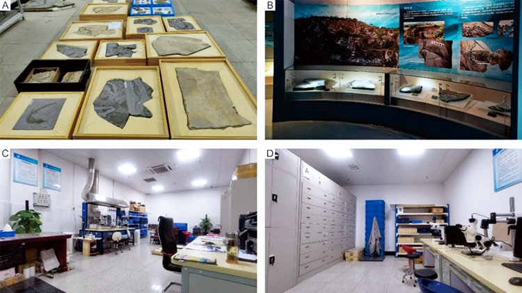 巢湖野外站观测试验场地的室内试验观测场地(A.安徽省地质博物馆巢湖动物群标本陈列和储存室;B.巢湖动物群展示专区;C.化石修复室;D.实验室)
