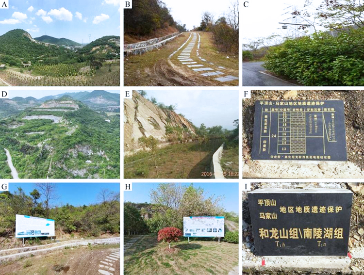 (A.平顶山西剖面全景;B.科考步道;C.监控探头;D.马家山剖面全景;E.排水沟;F、I.界碑说明牌;G、H.大型说明牌)