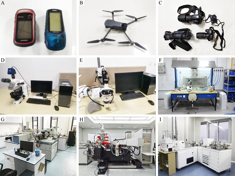 (监测设备:A.手持GPS,B.大疆无人机,C.照相机与摄像机;观察设备:D.Carl Zeiss偏光显微镜,E. Carl Zeiss体式显微镜;化石修复系统:F.化石气动修复系统;分析设备:G.MAT-253稳定同位素质谱仪,H. Nano-SIMS纳米离子探针,I.MC-ICPMS多接收杯电感耦合等离子比值质谱仪)