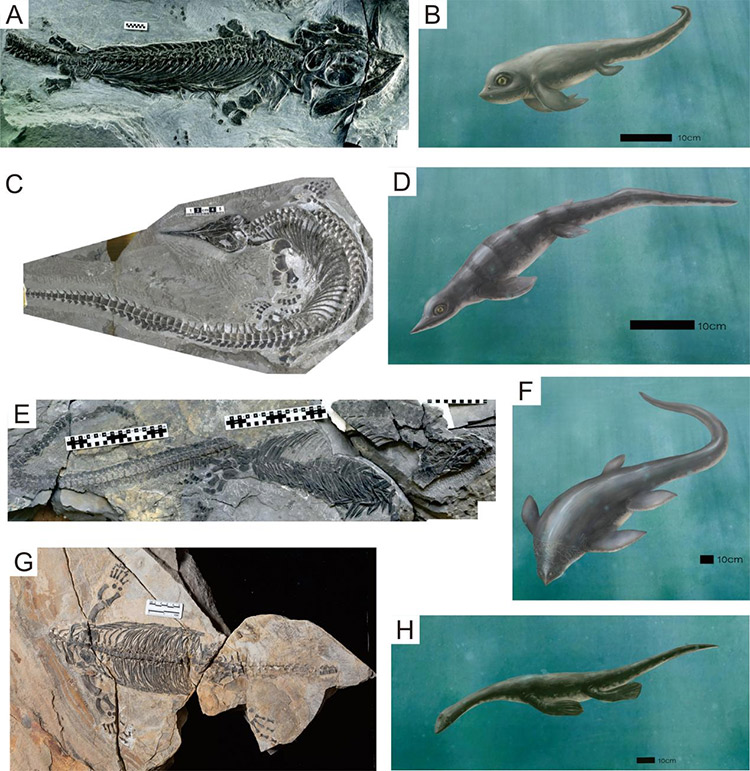(A.柔腕短吻龙化石标本;B.柔腕短吻龙复原图;C.巢湖龙化石标本;D.巢湖龙复原图;E.小头刚体龙化石标本;F.小头刚体龙复原图;G.盘乌喙骨马家山龙化石标本;H.盘乌喙骨马家山龙复原图)